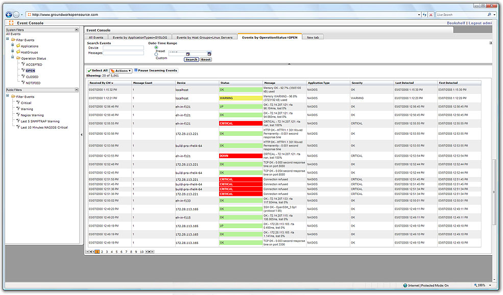 監視イベントは、到着するとNOCオペレータに引き渡されます。NOCコンソールはm、受け付けたメッセージを適切な運用状態に分類し、アクションによってすばやく対応します。運用状態と使用可能なアクションは、各インストレーション毎のニーズに合わせてカスタマイズすることができます。